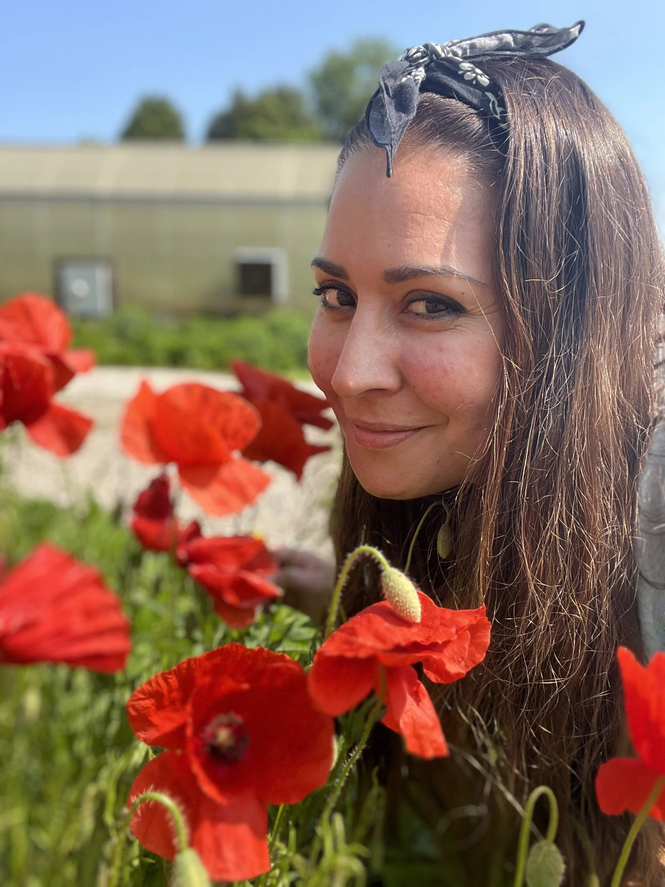 Helen with poppy flowers at the United Plant Savers medicinal forest in Ohio.